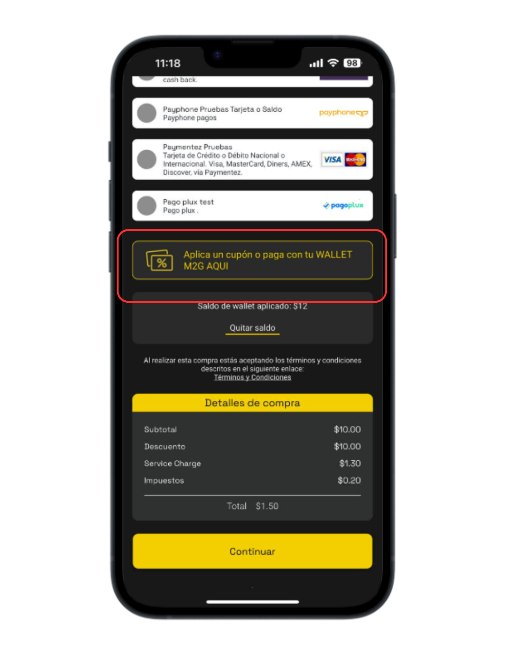 - Haz clic en "Continuar" y, en el método de pago, selecciona el botón "Pagar con M2G Wallet".